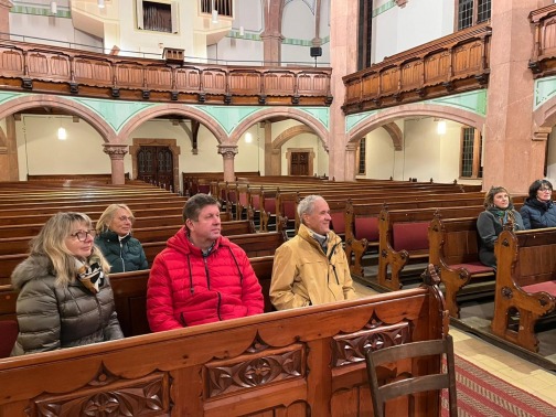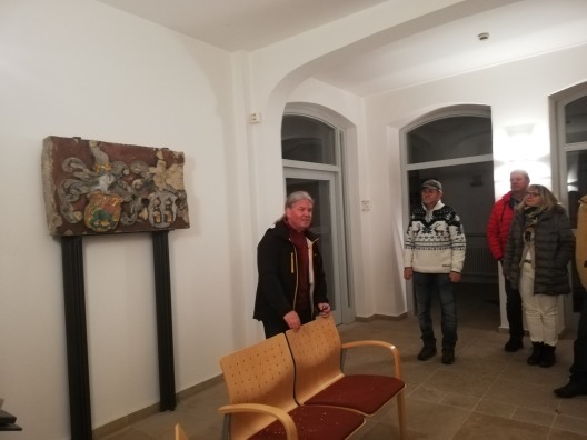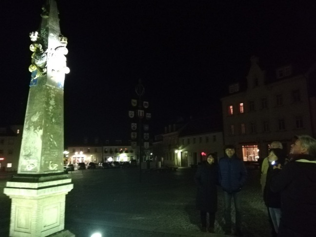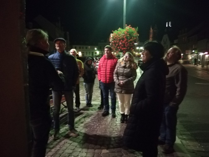 Wir sind gespannt auf unseren Stadtführer. Auf die Minute genau kommt er voller Elan und wir wissen, es wird toll. Viele spannende Geschichten auch für die, die meinen, Wilsdruff zu kennen, hat er für uns parat. Das Rathaus öffnet er für uns zu dieser späten Stunde und wir schauen erfurchtsvoll vom Bürgermeisterbalkon über den Marktplatz. Die Kirche mit ihrem kunstvoll gestalteten Altar und der tollen Orgel lässt uns innehalten. Oft können wir auch schmunzeln, bei den lebhaften Darstellungen von Herrn Schlönvogt. Es ist sehr unterhaltsam und die Zeit rennt uns förmlich davon. Wir verabschieden ihn mit den Worten: „Das wiederholen wir auf jeden Fall und treffen uns nächstes Jahr auf einer neuen Route durch Wilsdruff“.