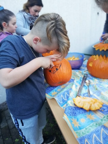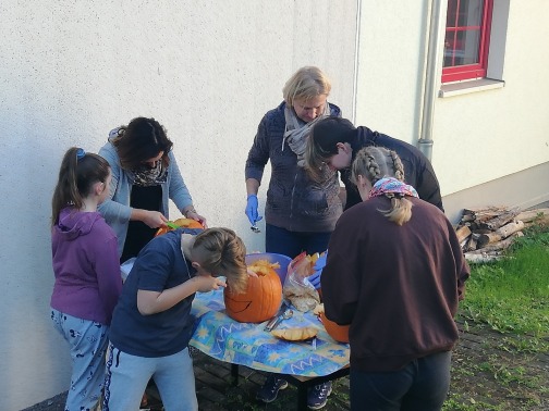 Kreativität und Spaß am Schnitzen an dem Halloweengemüse haben wir alle mitgebracht. Gleich machen sich die jüngsten an die Arbeit. Unter den bewundernden Blicken der Erwachsenen enstehen die hübschen Kürbisgesichter.