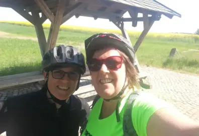 Nun, etwas erholt, geht es wieder in den Wald hinein. Es ist fast ein bisschen kühl, denke ich. Doch über eine Jacke muss ich bald nicht mehr nachdenken. Immer leicht bergan friert mich garantiert nicht. Niemand wird zurückgelassen. Mich begleiten zuverlässig Susi und Kerstin auf dem E-Bike. Das spornt mich an. Ich mach nicht schlapp und trete in die Pedale. Den „Muttigang“ hebe ich mir für später auf. Denn ich weiß, da kommt erst noch die heutige Bergwertung.