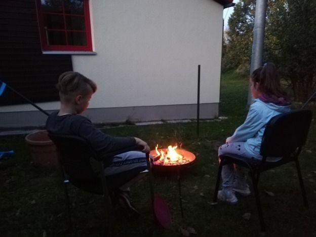 Zwischendurch wird schnell mal ein Punsch getrunken oder ein leckeres Stück Kürbiskuchen genascht. Wenn alles fertig ist, machen wir das gemütliche Feuer an und lassen den Knüppelkuchen bräunen. Auch die Kürbissuppe schmeckt wunderbar.