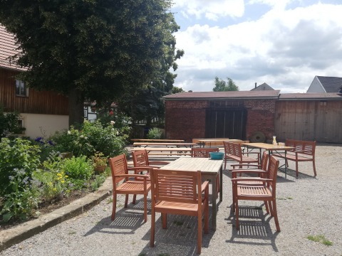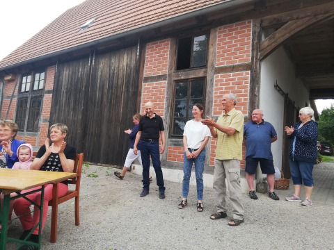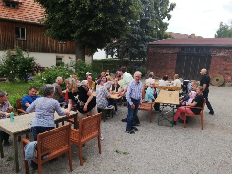 Die Sonne meint es heute fast zu gut. Wir haben Glück und es sind auch ein paar Wölkchen am Himmel. Fachwerk, schöne Blumen und einladene Tische - nun können die Gäste kommen. Langsam füllt sich der Hof. Über 40 Besucher habe ich diesmal gezählt. Gemütlich ist es hier auf jeden Fall. Manche Leute haben sich lange nicht gesehen, oder haben hier mal gewohnt, da gibt es viel zu reden und zu schauen. Viele Helfer und Bäcker haben einen genüsslichen Nachmittag organisiert. Viel zu schnell vergeht die Zeit, doch es bleibt eine schöne Erinnerung an diesen Nachmittag und die Freude auf nächstes Jahr, wenn wir wieder einladen dürfen zu einem gemeinsamen Kaffeetrinken bei einem netten Gastgeber in unserem Dörfchen. Danke Willi und Ulrike, dass wir bei Euch sein durften. Danke an alle Helfer und Bäcker für die Unterstützung.