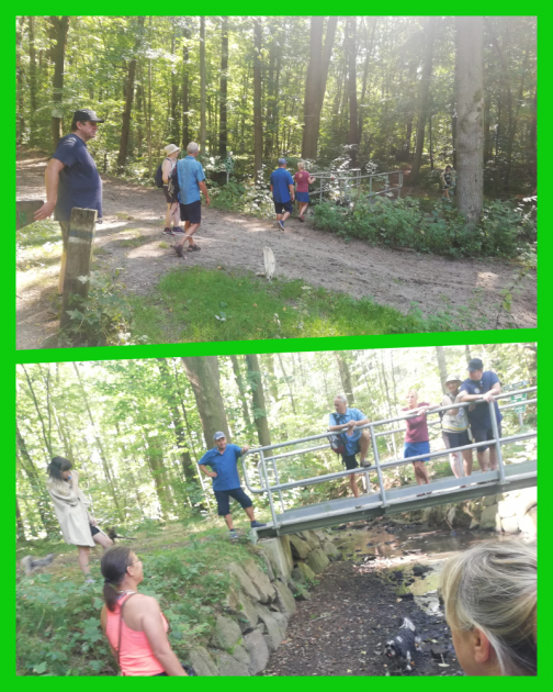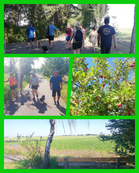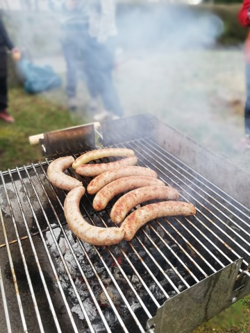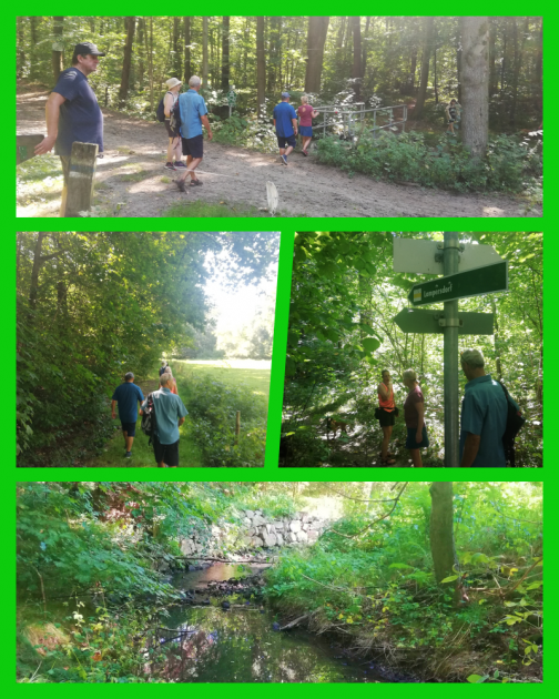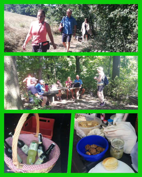 Schon bald erreichen wir den sehnsüchtig erwarteten Picknickplatz. Ich habe Durst, fast schon hochsommerliche Temperaturen begleiteten uns auf dem Weg. Doch im lichten Schatten der Bäume ist es angenehm. Der Andreas verwöhnt uns im Namen des Heimatvereins wieder. Leckere Fischbrötchen, knusprige Buletten und Kerstins saftigen Apfelkuchen, einen guten Kaffee gepaart mit einem Kaltgetränk ist doch genau das richtige jetzt. Die Pause genießen wir gemeinsam und plaudern über neue Ideen.