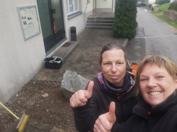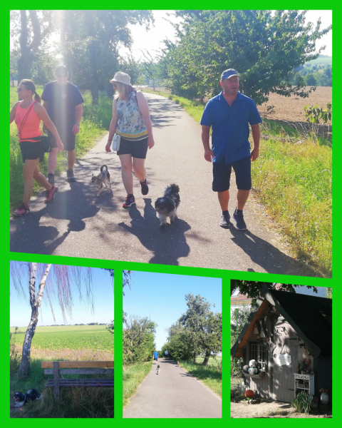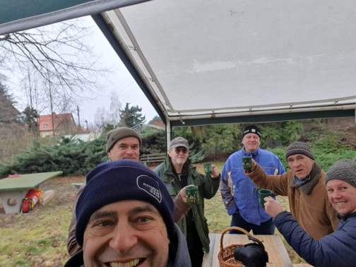 9.30 Uhr treffen wir uns an der Tischtennisplatte. Schön...so viele haben sich Zeit genommen, sogar eine kleiner Hund ist mit von der Radpartie. Das Wetter ist sehr schön, wenn auch ein wenig frisch am Morgen. Das hält uns aber nicht ab, schon nach 4 Kilometern eine neue Location in Rennersdorf zu "stürmen". Sie haben gerade erst die Luke geöffnet, da freuen wir uns schon über Kaffe und Kuchen oder auch ein kühles Blondes. Frisch gestärkt und etwas ausgekühlt geht´s wieder los. Schöne Weitblicke über die Rapsfelder sind ein Gedicht für jedes Auge. Kurz durchs Kesselsdorfer Gewerbegebiet schickt uns die Route auf eine alte Bahnstrecke. Hier könnte man auch prima wandern. Heute geht es aber mit dem Rad´l voran. Unseren Proviant haben wir immer dabei. Diesmal fährt ein Speisewagen mit. Dank des E-Bikes ist das kein Problem und wir sind unabhängig. Noch einen Berg erklimmen, dann gibt es Bocki und Brötchen. Getränke, Süßes.....alles mit. Klasse. Der kleine Gaskocher macht was er soll und so werden wir alle satt und zufrieden. Jetzt schaut uns die Sonne auch beim Essen zu.