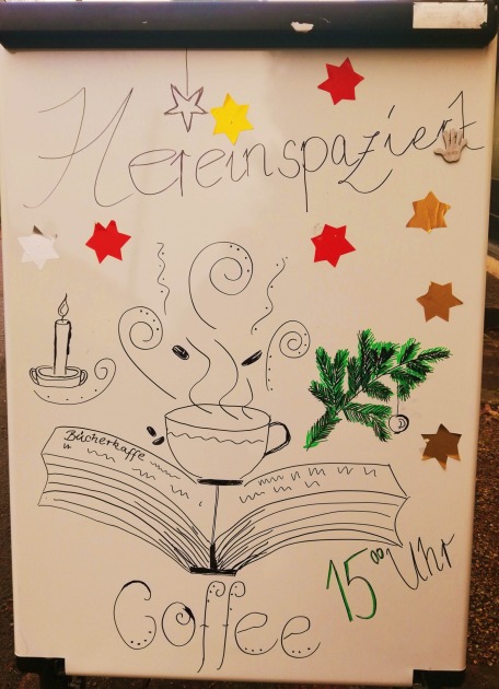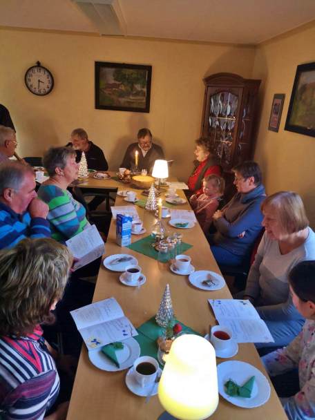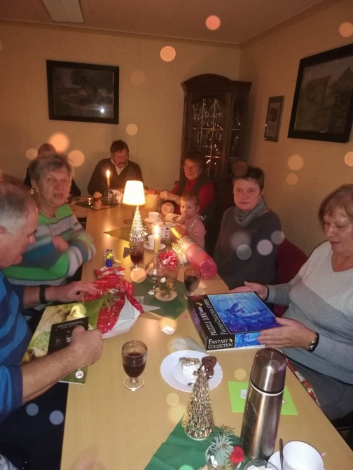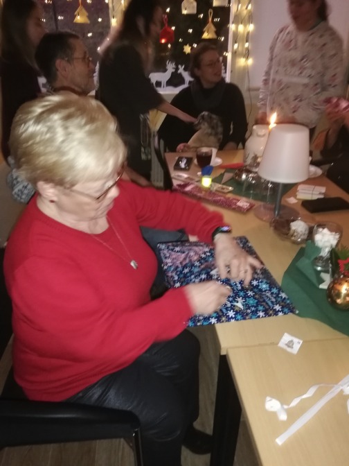 Schön! Langsam füllt sich der Raum und es wird immer gemütlicher. Das Murmeln der Leute vermischt sich mit der weihnachtlichen Musik und wir, das sind Kerstin Leue, Anja Koch und ich, schauen uns zufrieden an. Der Kaffeeduft verführt und leckerer Stollen und Kuchen muss einfach vernascht werden. Da schaut keiner auf die Kalorien. Nun wird es musikalisch, begleitet von wohlklingenden Flötentönen. Stille Nacht, Sind die Lichter angezündet und auch der Tannenbaum wird besungen. Ach wie wunderbar. Weihnachtsgedichte und lustige Geschichten verkürzen die Zeit, bis zur Wichtellotterie. Jedes Los gewinnt, und so ist es fast wie beim Schrottwichteln, spannend, lustig und es wird getauscht und bestaunt.