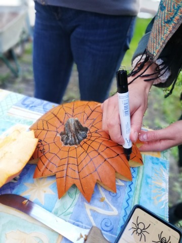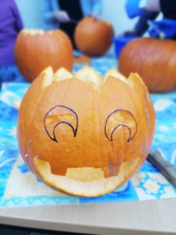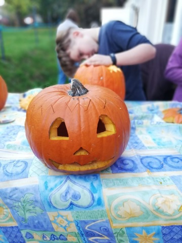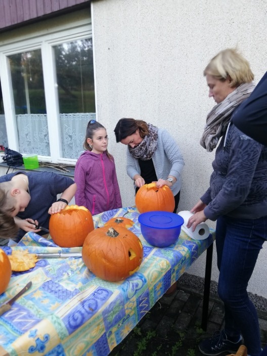 Kreativität und Spaß am Schnitzen an dem Halloweengemüse haben wir alle mitgebracht. Gleich machen sich die jüngsten an die Arbeit. Unter den bewundernden Blicken der Erwachsenen enstehen die hübschen Kürbisgesichter.