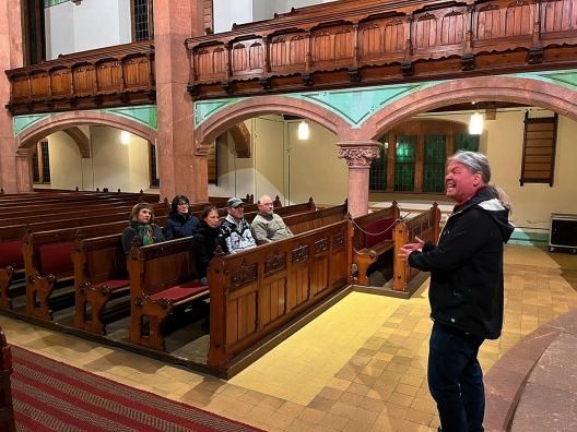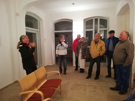 Wir sind gespannt auf unseren Stadtführer. Auf die Minute genau kommt er voller Elan und wir wissen, es wird toll. Viele spannende Geschichten auch für die, die meinen, Wilsdruff zu kennen, hat er für uns parat. Das Rathaus öffnet er für uns zu dieser späten Stunde und wir schauen erfurchtsvoll vom Bürgermeisterbalkon über den Marktplatz. Die Kirche mit ihrem kunstvoll gestalteten Altar und der tollen Orgel lässt uns innehalten. Oft können wir auch schmunzeln, bei den lebhaften Darstellungen von Herrn Schlönvogt. Es ist sehr unterhaltsam und die Zeit rennt uns förmlich davon. Wir verabschieden ihn mit den Worten: „Das wiederholen wir auf jeden Fall und treffen uns nächstes Jahr auf einer neuen Route durch Wilsdruff“.