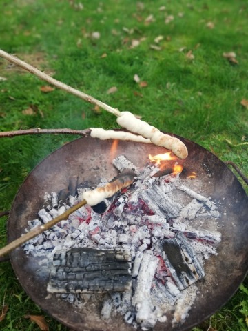 Zwischendurch wird schnell mal ein Punsch getrunken oder ein leckeres Stück Kürbiskuchen genascht. Wenn alles fertig ist, machen wir das gemütliche Feuer an und lassen den Knüppelkuchen bräunen. Auch die Kürbissuppe schmeckt wunderbar.