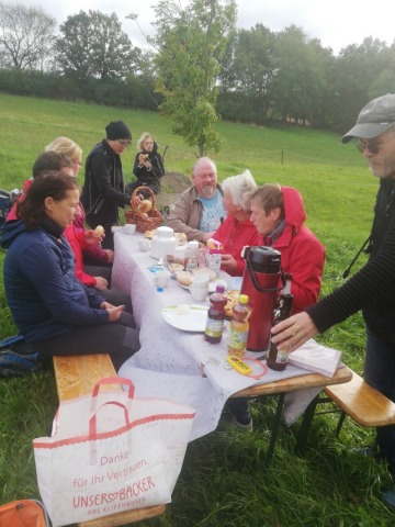 Wir machen heute etwas weiter oben Rast. Andreas Koch vom Heimatverein Hühndorf erwartet uns schon mit einer lecker gedeckten Tafel. Buletten, Fischbrötchen, belegte Brote und zum Abschluß noch einen frisch gebacken Apfelkuchen...... Kaffee, Tee und auch ein leckeres Kaltgetränk.....was will man mehr. Ich bin dankbar für die Pause. Auch unsere kleinste Teilnehmerin hat sich ein Päuschen verdient.