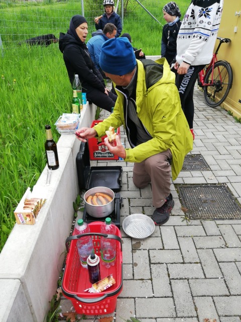 9.30 Uhr treffen wir uns an der Tischtennisplatte. Schön...so viele haben sich Zeit genommen, sogar eine kleiner Hund ist mit von der Radpartie. Das Wetter ist sehr schön, wenn auch ein wenig frisch am Morgen. Das hält uns aber nicht ab, schon nach 4 Kilometern eine neue Location in Rennersdorf zu "stürmen". Sie haben gerade erst die Luke geöffnet, da freuen wir uns schon über Kaffe und Kuchen oder auch ein kühles Blondes. Frisch gestärkt und etwas ausgekühlt geht´s wieder los. Schöne Weitblicke über die Rapsfelder sind ein Gedicht für jedes Auge. Kurz durchs Kesselsdorfer Gewerbegebiet schickt uns die Route auf eine alte Bahnstrecke. Hier könnte man auch prima wandern. Heute geht es aber mit dem Rad´l voran. Unseren Proviant haben wir immer dabei. Diesmal fährt ein Speisewagen mit. Dank des E-Bikes ist das kein Problem und wir sind unabhängig. Noch einen Berg erklimmen, dann gibt es Bocki und Brötchen. Getränke, Süßes.....alles mit. Klasse. Der kleine Gaskocher macht was er soll und so werden wir alle satt und zufrieden. Jetzt schaut uns die Sonne auch beim Essen zu.